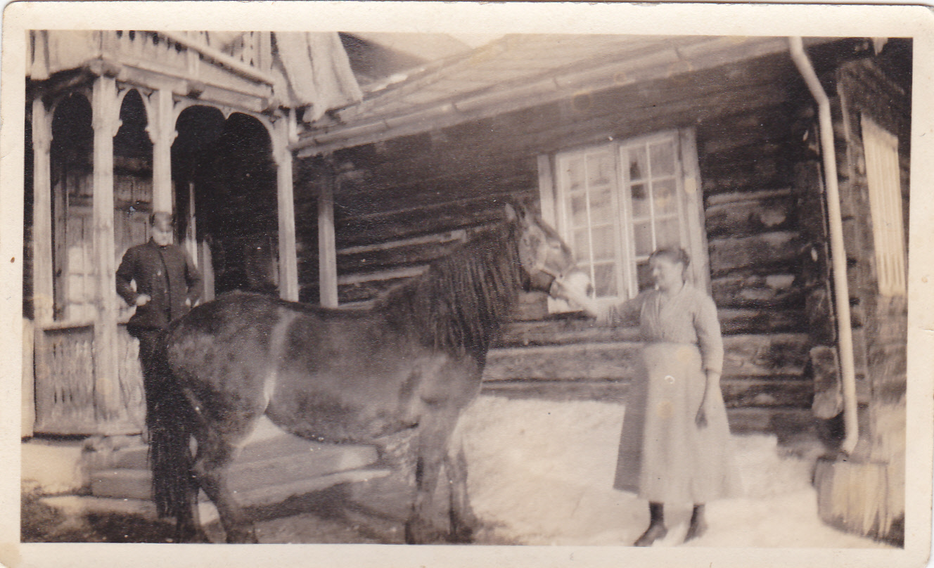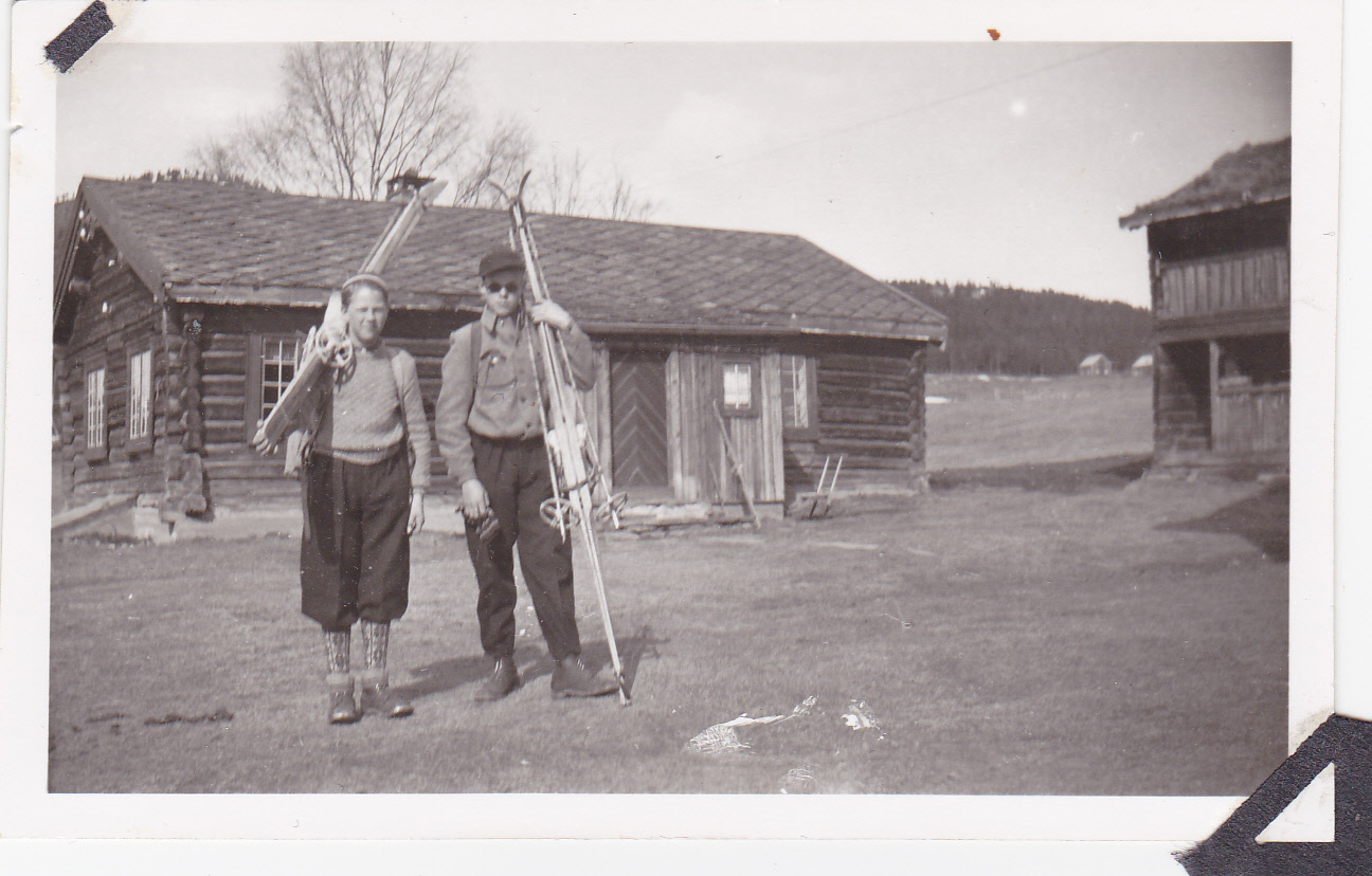 Kaffekvernhuset i bakgrunnen og en skokk nabounger i høyvogna sammen med onkel og mor, 2 og 6 år- ca 1934. (La oss håpe det ikke ligger en dypere mening i måten noen av ungene hilser på.) Til høyre i vogna, min onkel og min mor, og stående morfar Håkon.