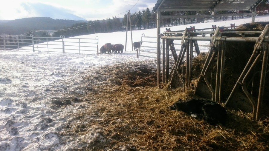 Bjørk ligger og passer på at dyra holder seg unna mens jeg jobber i fjøset.