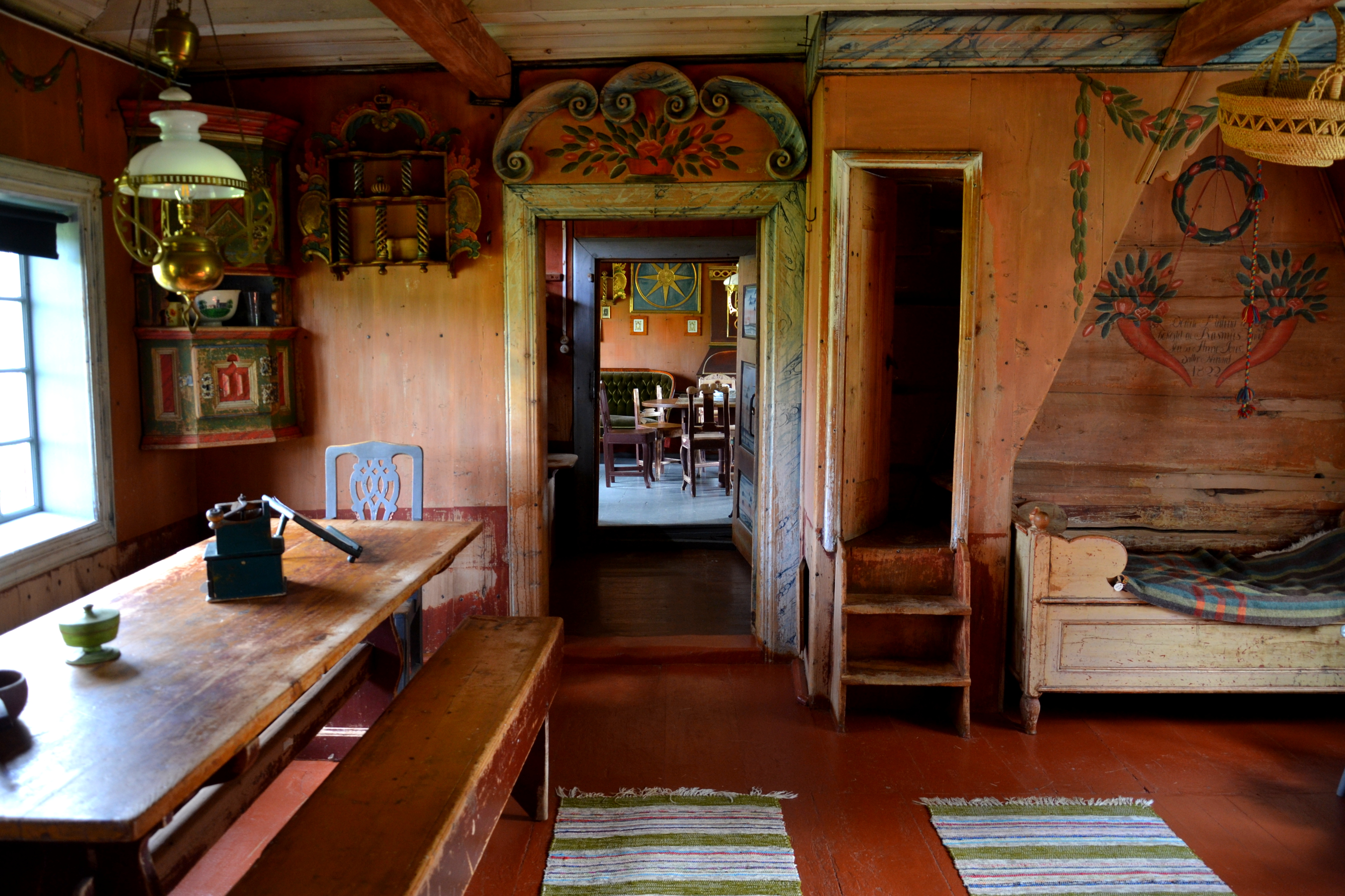 Inne i det som var den opprinnelige stua (huset), imponeres vi av den rike treutskjæringen og malekunsten.