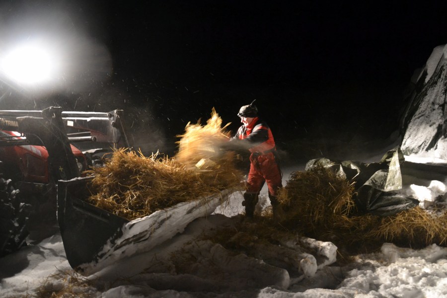 Dyra må ha stell, uansett vær, føre eller høytider. Her skal det kjøres halm til dem