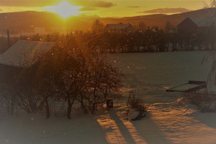 Det lette snødrysset blir som gull i skinnet fra ettermiddagens siste solstråler