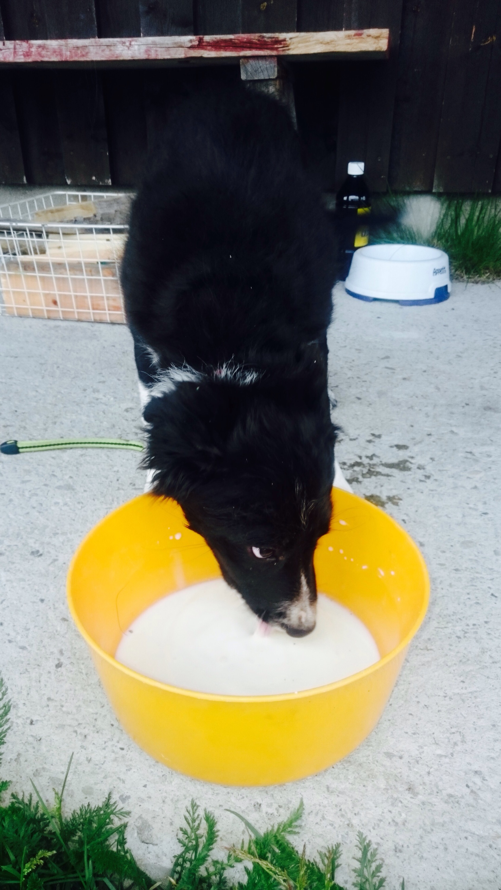 Heldige Bjørk fikk smake en liten skvett av geitemelka. Den falt i smak!